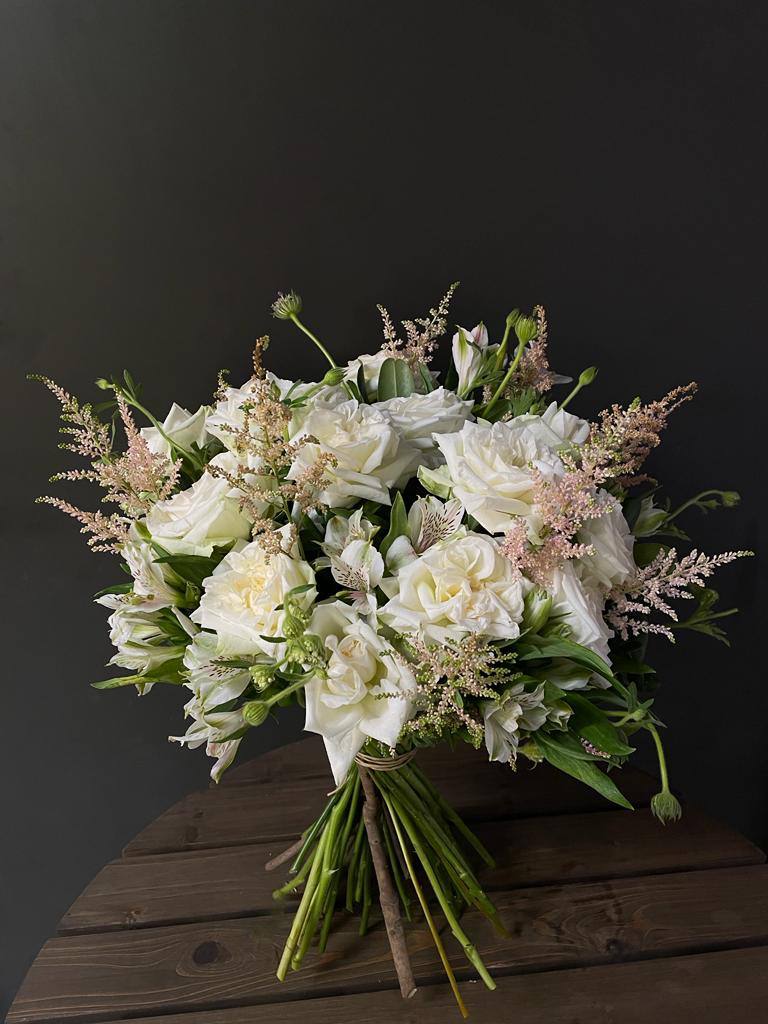 The Elinora Bouquet is a mix of white garden roses, astilbe, alstroemeria and lace flowers with a range of complimentary flower fillers.