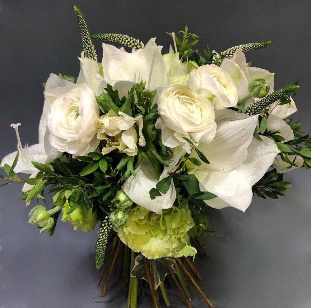 The Gabriella Bouquet is a mix of amaryllis, ranunculus, veronica, eustoma and seasonal complimentary flower fillers.