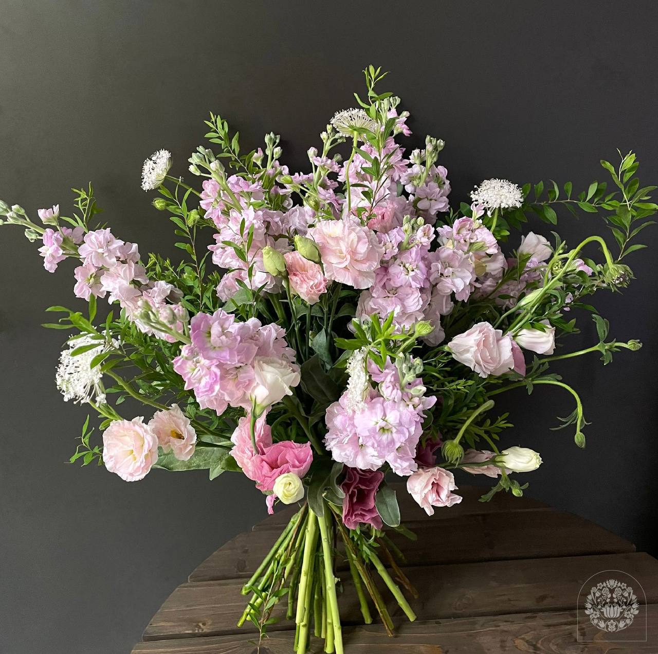 The Kamelia Blush Bouquet is a mix with pink eustoma, hoary stock and a range of seasonal complimentary flower fillers.